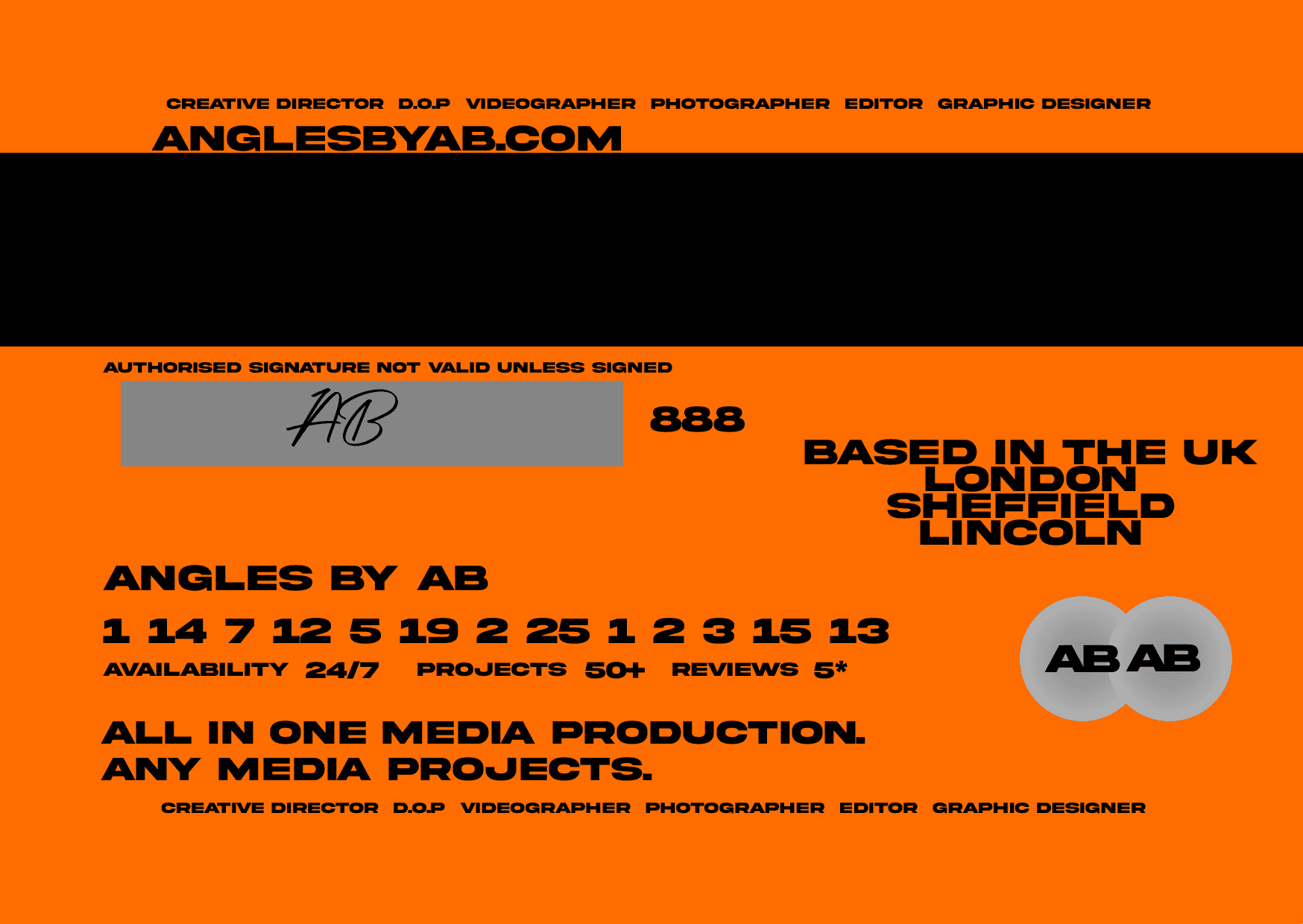 My graphic design work reflects a versatile and evolving creative practice, spanning across multiple formats and purposes. I have developed a range of visual assets including posters, business cards, logos, title cards, and digital thumbnails, each tailored to communicate a clear message and engage a specific audience. Through these projects, I have explored composition, typography, colour theory, and branding, ensuring that every design is both visually striking and purposeful. My work demonstrates not only technical skill but also a growing understanding of visual storytelling, allowing me to create designs that are both aesthetically compelling and strategically effective. I am open to all your graphic design needs! Have a scroll through some of my work, here is some graphic design work I have created for my own brand "Angles By AB":